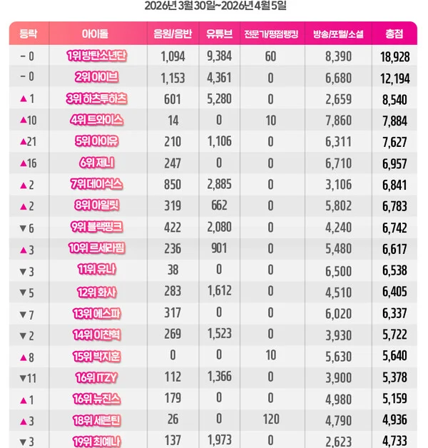 Durante a semana em questão, a classificação do Idol Chart revelou que o BTS dominou com uma pontuação total de 10.368, consolidando sua posição como líderes entre os ídolos coreanos. O grupo, que tem uma base de fãs massiva e dedicada, demonstrou seu poder de engajamento não apenas por meio de suas músicas, mas também pelas interações nas redes sociais e visualizações no YouTube. O desempenho no YouTube foi particularmente impressionante, com 9.384 pontos, mostrando a eficácia de suas estratégias de marketing digital e a qualidade de seus conteúdos visuais.